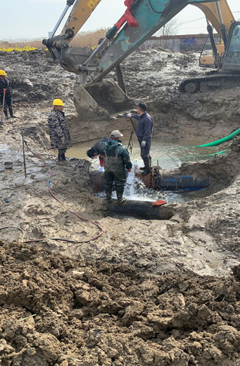 搶修就是命令,時間就是效率。根據公司主要領導安排,于2020年3月15日上午8點40分,朱忠東師傅、嚴慶章師傅等先后帶領我們維修人員、機具、物料進入現場作前期準備,一邊開挖工作坑,一邊抽水機抽水,采取歇人不歇機的辦法保證迅速挖出漏水口。由于農田土質松軟,再加上長時間被水浸泡,導致挖機多次陷入土中,嚴重影響了開挖進度。經驗豐富的嚴師傅立即向指揮部反映,調來了一個大鋼板作為鋪墊,再將挖機置于鋼板上進行操作,順利解決了挖機塌陷的問題。經過了兩個小時的開挖,漏水口終于顯現出來。朱師傅立即換上了“戰服”,“潛入”工作坑為搶修作準備。