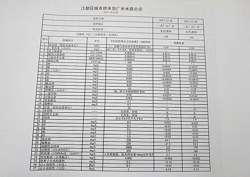 2017年12月江都區城市供水出廠水水質公示