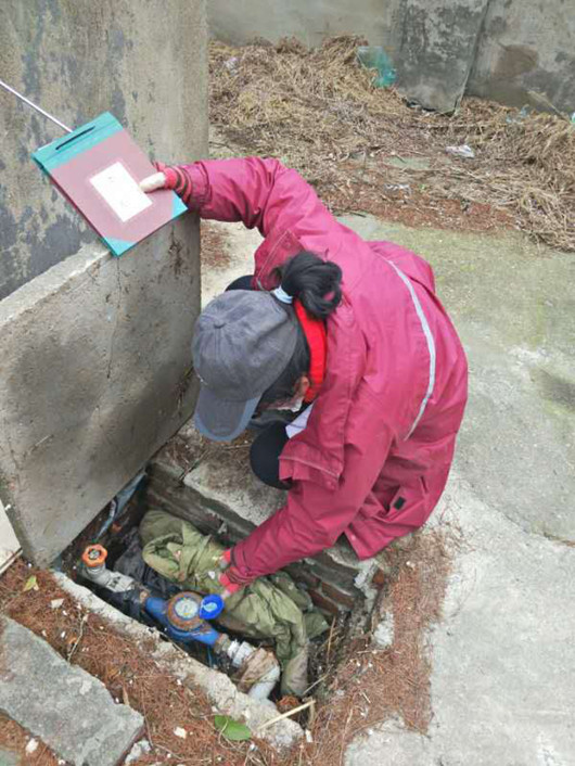 2月21日上午,多云。朱師傅頭戴鴨舌帽,佩戴口罩,膠手套,穿著雨衣,做好個(gè)人防護(hù)措施,帶著抄收賬簿、分揀好的發(fā)票、手電筒、撬棒來到二姜區(qū)域,開始“抄收復(fù)工”。“你是誰,廠子還沒復(fù)工,領(lǐng)導(dǎo)沒來呢!”二姜四方電鍍廠門衛(wèi)一開始沒認(rèn)出全副武裝,只露出兩只眼的朱師傅,很警惕。“姜師傅,您好!我是抄表員小朱,來看看急降溫后廠子供水是否正常運(yùn)行,順便抄表。”朱師傅配合好鞋底消毒和體溫槍測量體溫后,先在廠子里巡查一圈,未發(fā)現(xiàn)漏水現(xiàn)象,然后來到廠西南角水表處,她嫻熟地打開水表井,“表深要確保表讀數(shù)精確,避免用戶不滿意”,她一邊嘀咕著一邊左手拿出手電筒照明,右手用紙手帕擦拭去水表玻璃上的污垢,認(rèn)真讀表,確認(rèn)讀數(shù)“7078m³”。
